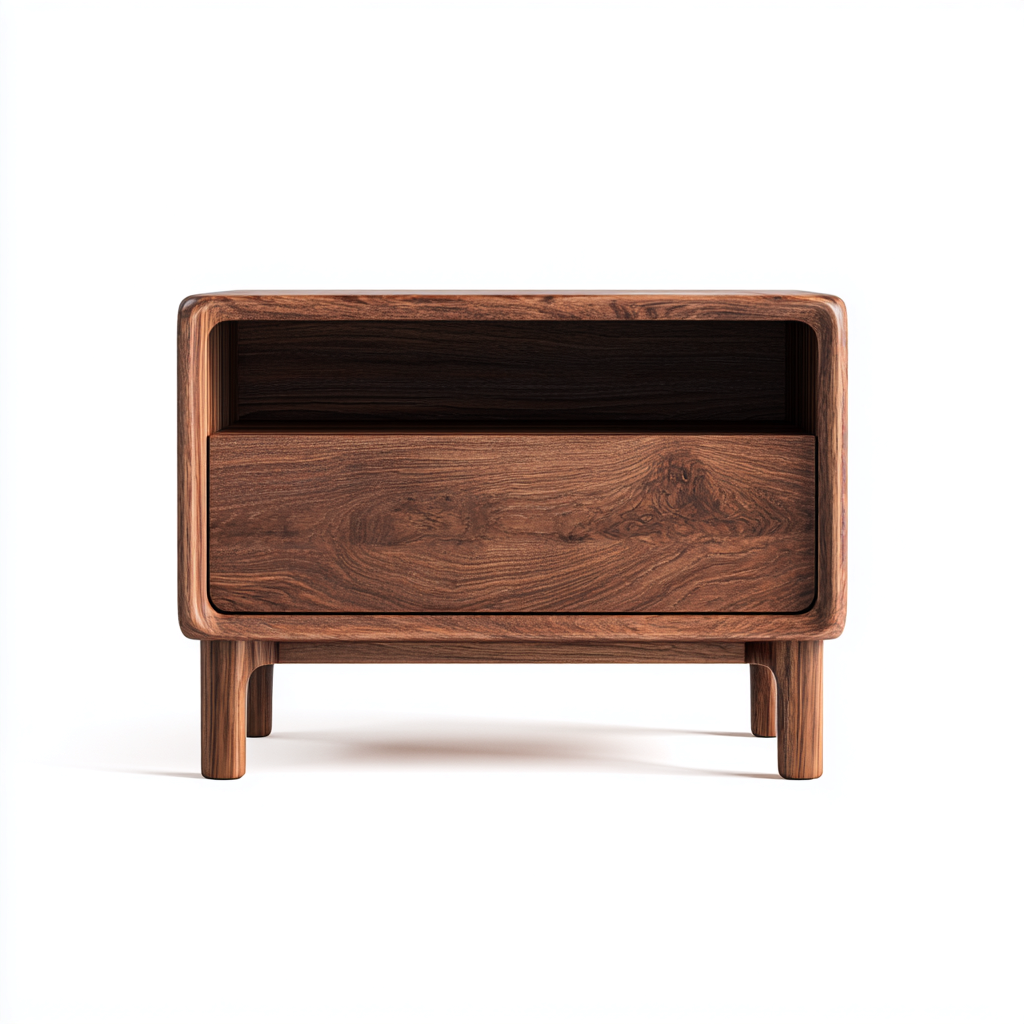 Questo comodino in legno massello presenta un design moderno e lineare, caratterizzato da angoli arrotondati e una struttura bassa ideale per camere da letto dallo stile contemporaneo. L’ampio vano aperto e il cassetto inferiore offrono praticità e un’estetica raffinata.