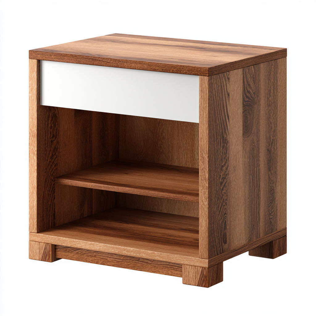 Questo comodino unisce una struttura in legno con un frontale del cassetto in colore bianco, creando un contrasto moderno e armonioso. Le linee semplici e la presenza dello scomparto aperto rendono il prodotto pratico e adatto a diverse tipologie di camera da letto.