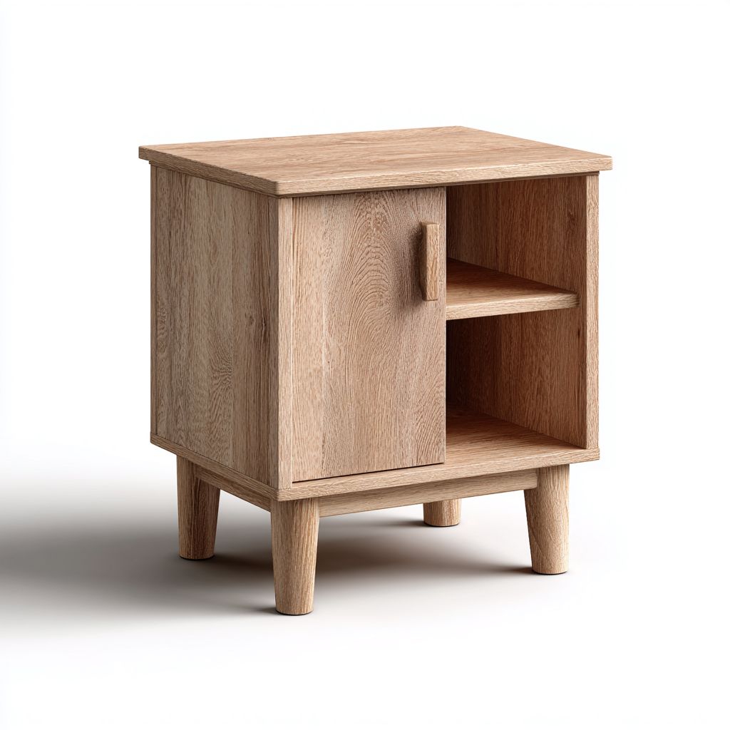 Questo comodino in legno presenta un design moderno caratterizzato da linee semplici e una pratica combinazione di vano aperto e anta. La finitura in colore legno chiaro dona un aspetto naturale e armonioso ideale per la camera da letto.