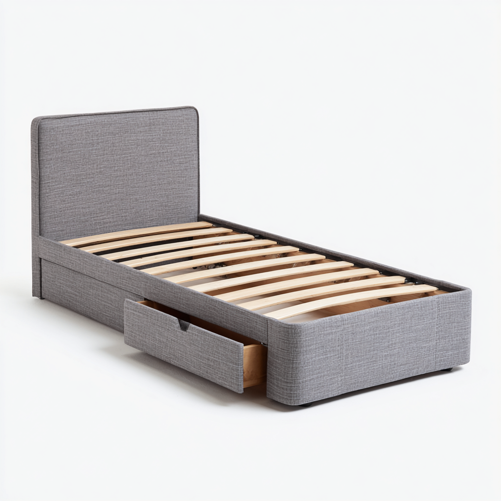 La struttura è rivestita in tessuto grigio resistente e facile da mantenere. Le doghe in legno assicurano un supporto stabile per il materasso, mentre i cassetti laterali sono realizzati in legno con guide scorrevoli per un’apertura fluida.