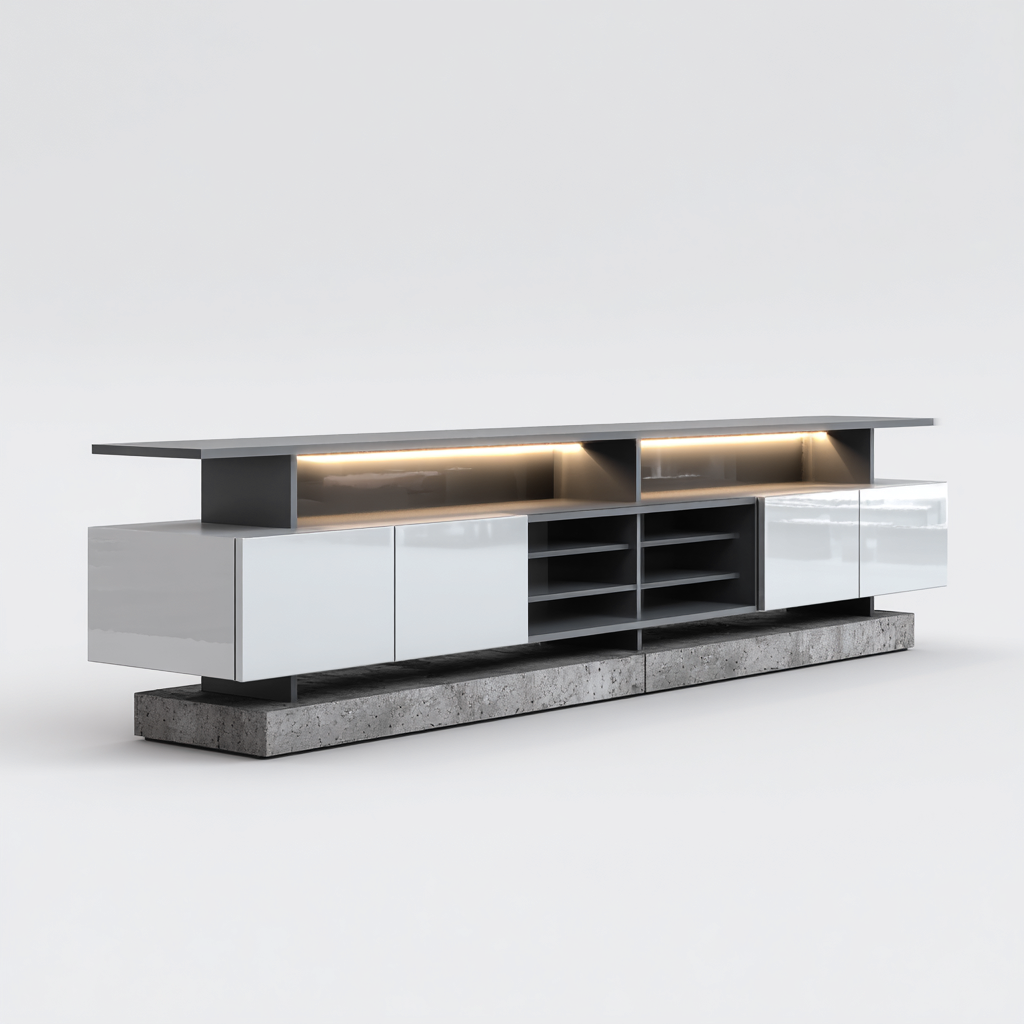 Struttura realizzata in pannelli di legno con superfici bianche lucide e dettagli in grigio. La base presenta una finitura effetto cemento che dona stabilità visiva e un carattere moderno. I vani superiori sono integrati con illuminazione LED per un tocco decorativo funzionale.
