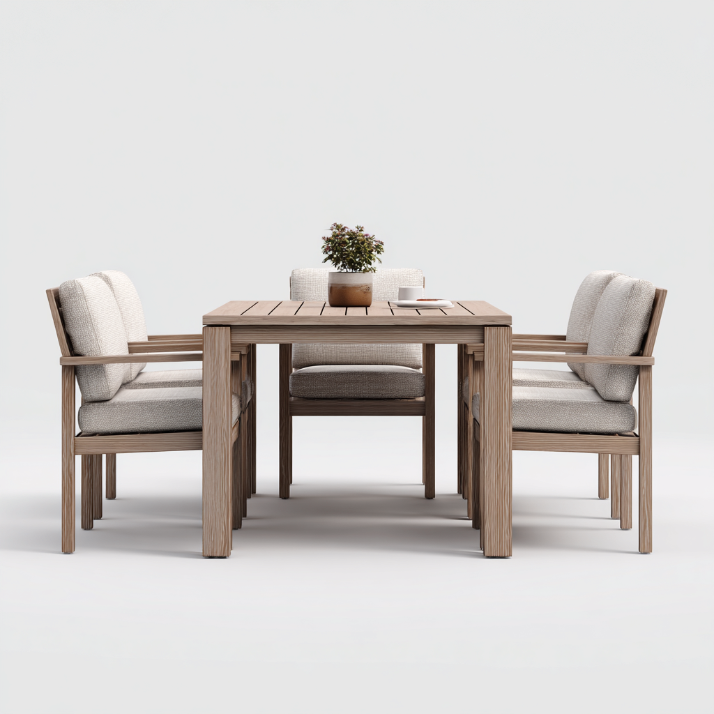 Questo set da pranzo per terrazza combina un tavolo in legno naturale con quattro sedie imbottite, offrendo uno stile moderno e confortevole ideale per ambienti esterni come giardini, terrazze e portici.
