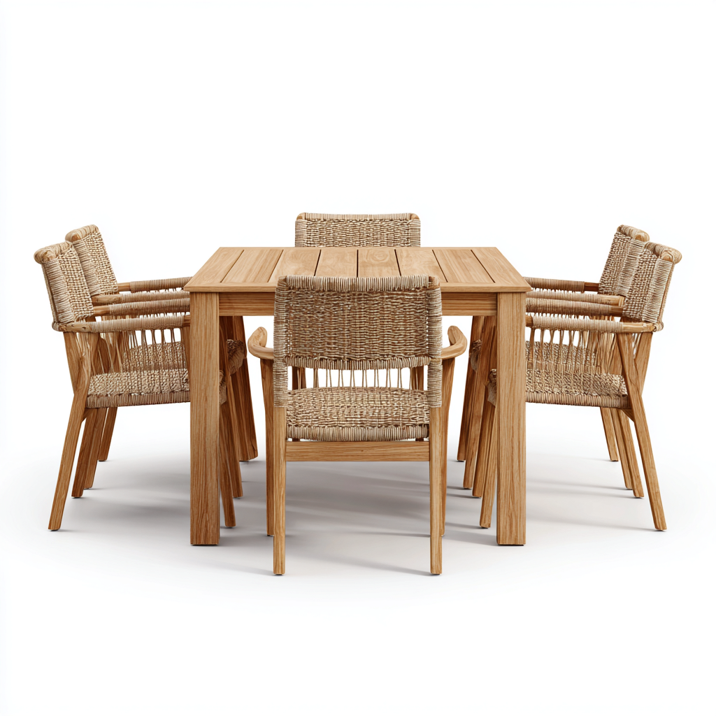 Questo set da pranzo per terrazza combina un tavolo in legno massello con sei sedie in intreccio naturale, offrendo un’estetica calda e armoniosa ideale per spazi esterni come terrazzi e giardini.