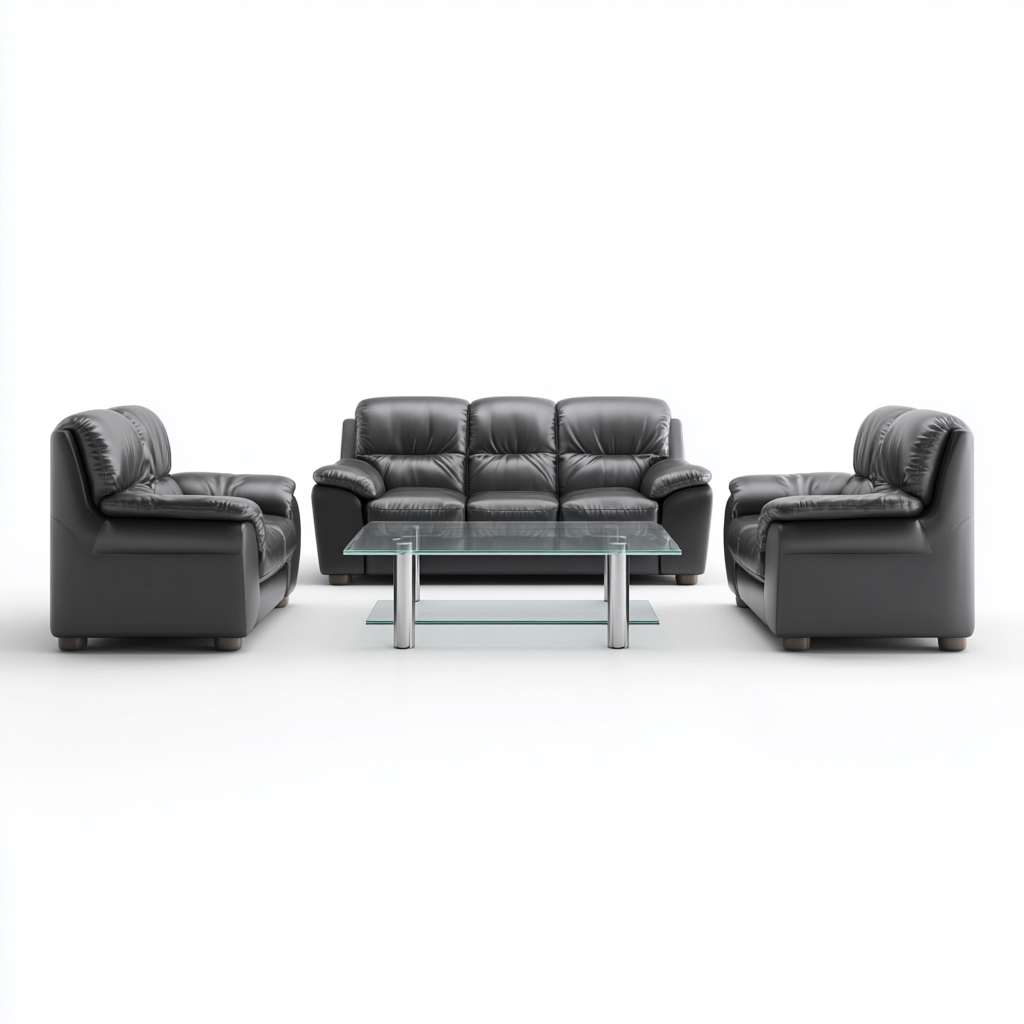 Divano e poltrone sono rivestiti in pelle resistente di colore nero, con imbottitura morbida che assicura comfort costante e supporto adeguato. Il tavolino è realizzato in vetro con struttura solida, pensato per garantire stabilità e durata nell’uso domestico.