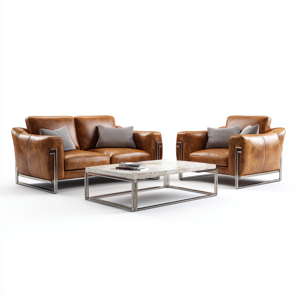 Il divano e la poltrona sono realizzati con una struttura solida e rivestimento in pelle di colore marrone. Il tavolino presenta un piano dall’aspetto marmorizzato con struttura in metallo, garantendo stabilità e un’estetica contemporanea.