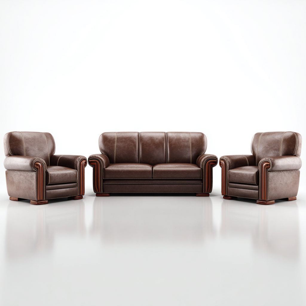La struttura è realizzata con telaio robusto e rivestita in similpelle di colore marrone. I braccioli con dettagli decorativi e le finiture curate valorizzano l’aspetto elegante del set, garantendo al tempo stesso una buona durata nel tempo.