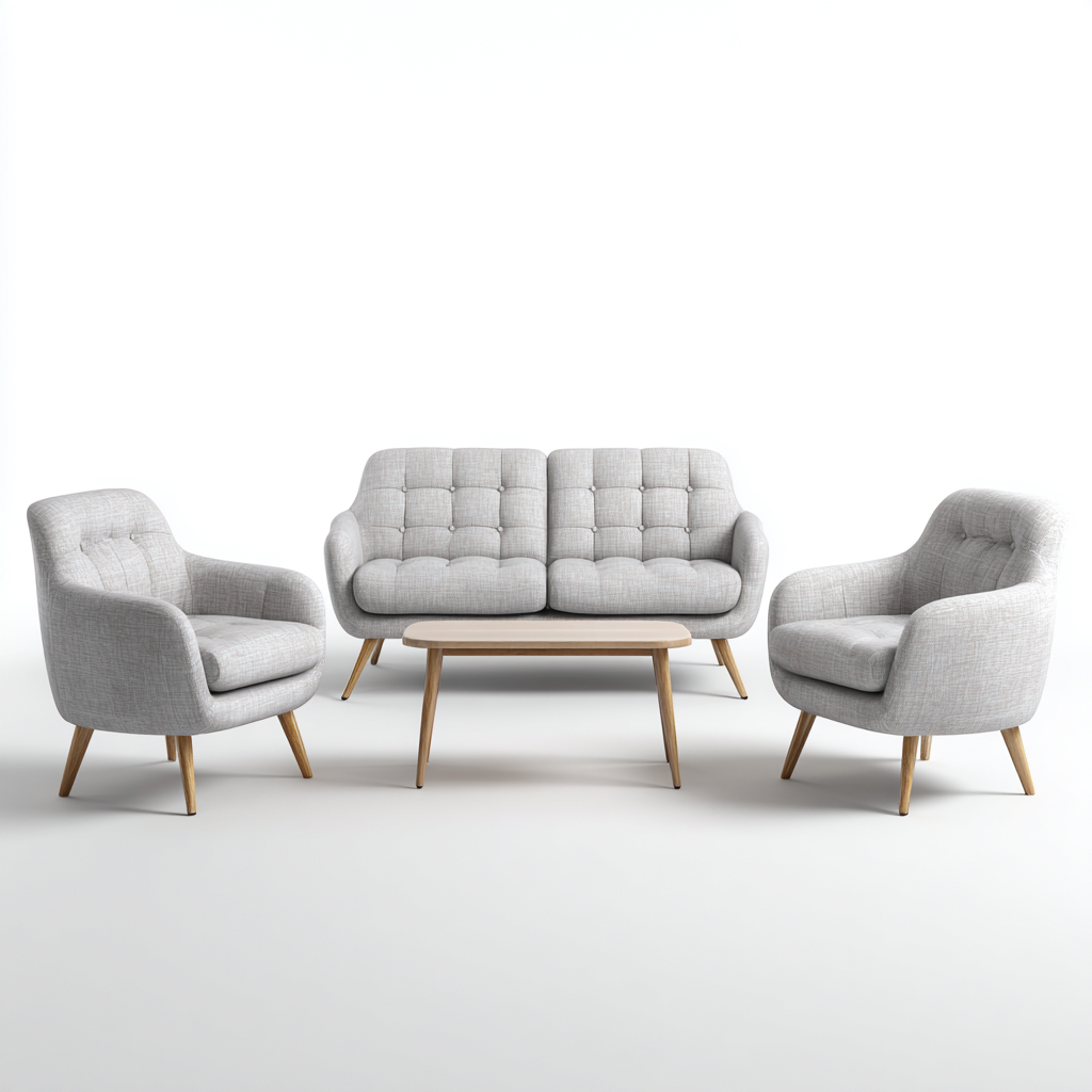 Questo set divani è progettato per arredare il soggiorno con uno stile scandinavo equilibrato e luminoso. La composizione include un divano a due posti, due poltrone singole e un tavolino centrale, creando una zona relax armoniosa e funzionale.
