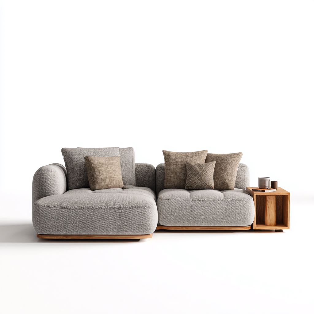 Questo set divani è pensato per arredare il soggiorno con uno stile moderno e funzionale. La composizione comprende un divano con chaise longue e un tavolino laterale coordinato, ideali per creare un’area relax equilibrata e pratica.