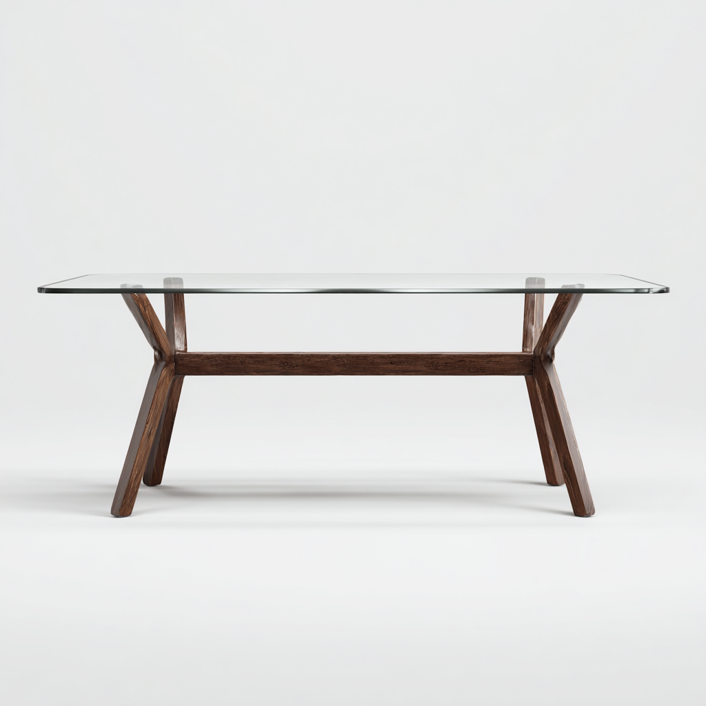 Tavolo da pranzo dal design moderno con piano in vetro temperato e struttura in legno massello finitura marrone. La combinazione dei materiali conferisce leggerezza visiva e solidità, ideale per arredare con eleganza la sala da pranzo.