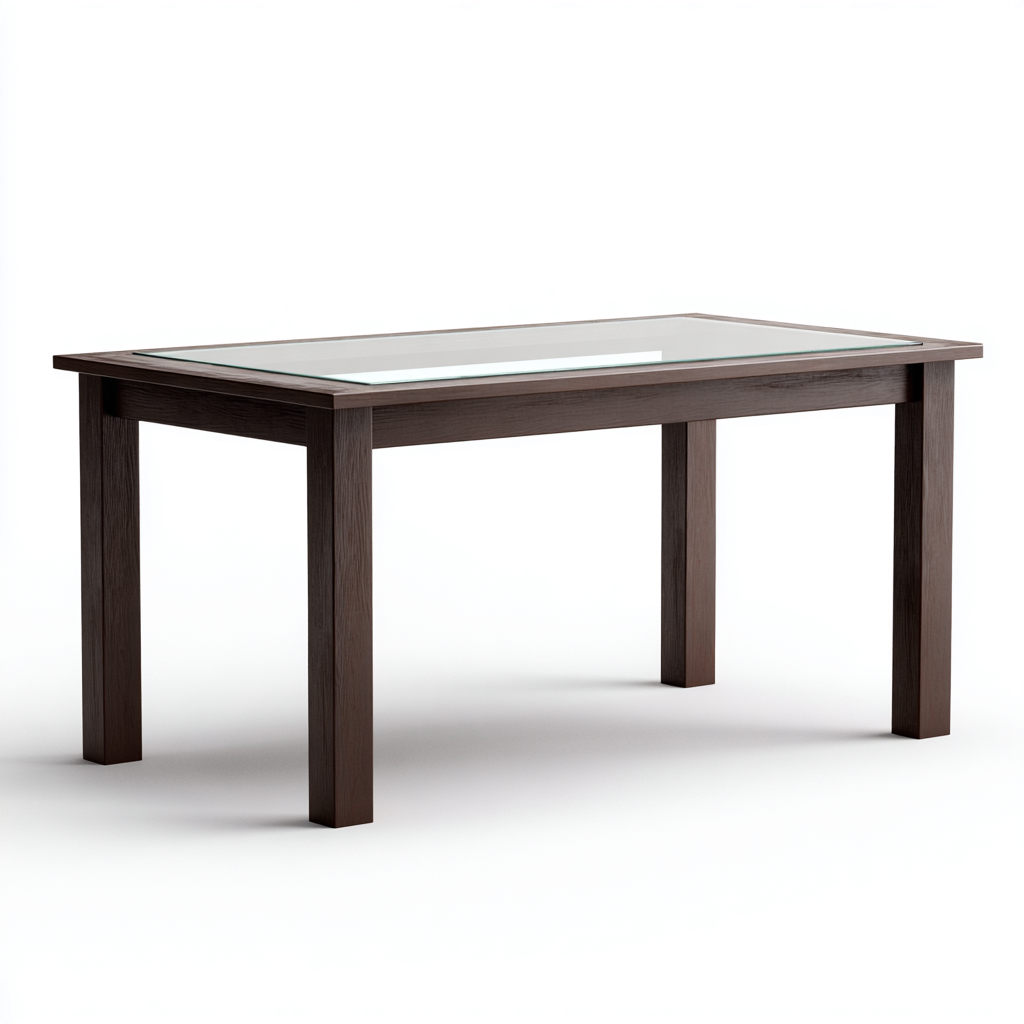 Questo tavolo da pranzo combina una solida struttura in legno scuro con un raffinato piano in vetro, creando un elemento d’arredo moderno e adatto alla sala da pranzo.
